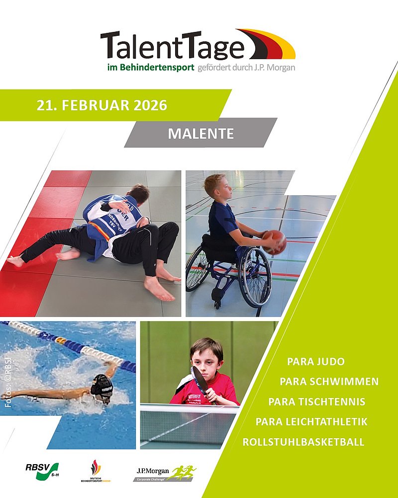 Am 21.02.2026 findet von 10:00 Uhr - 15:00 Uhr in Malente wieder ein TalentTag statt. Wir suchen junge Menschen mit Beeinträchtigung die Lust auf Nachwuchs- und Wettkampfsport in den Sportarten: Para Judo, ID Judo, Para Leichtathletik, Para Schwimmen, Rollstuhlbasketball und Para Tischtennis haben.